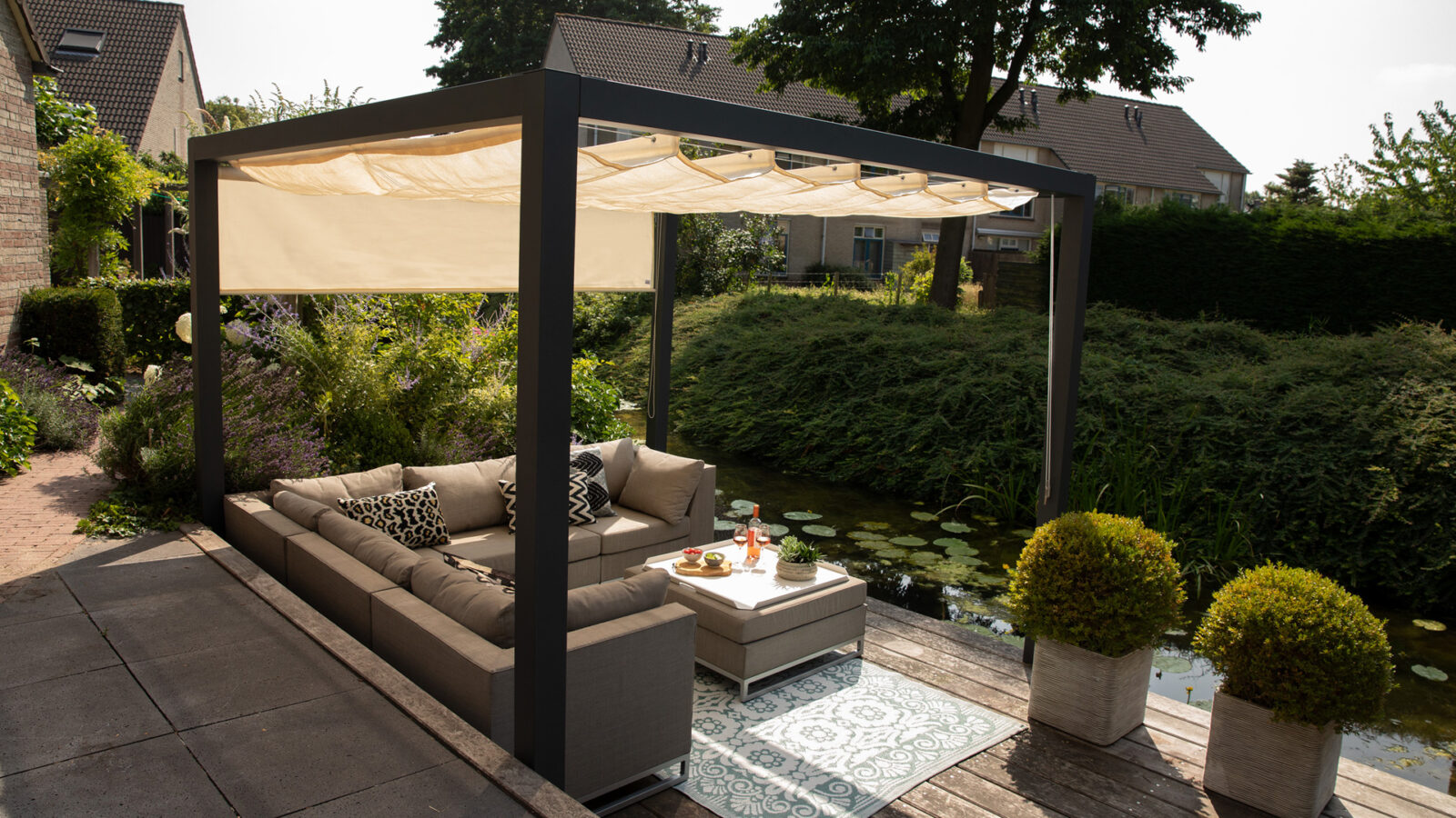 Pergola aluminiowa wraz z roletą poziomą rzymską Coolfit® tworzy pełną konstrukcję zacieniająca strefę relaksu na tarasie lub w ogrodzie. Występuje w trzech wariantach konstrukcyjnych i różnych rozmiarach. Istnieje możliwość dopasowania pergoli do każdego wymiaru tarasu.